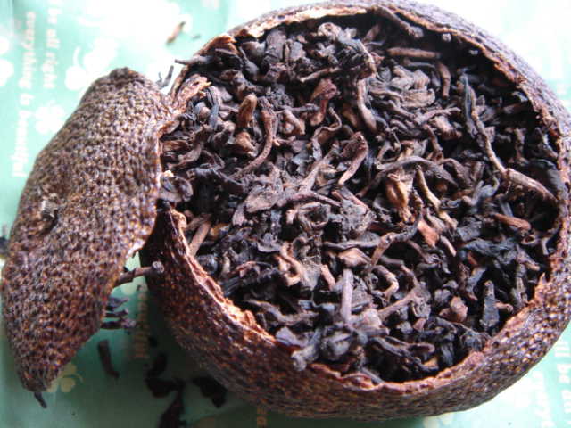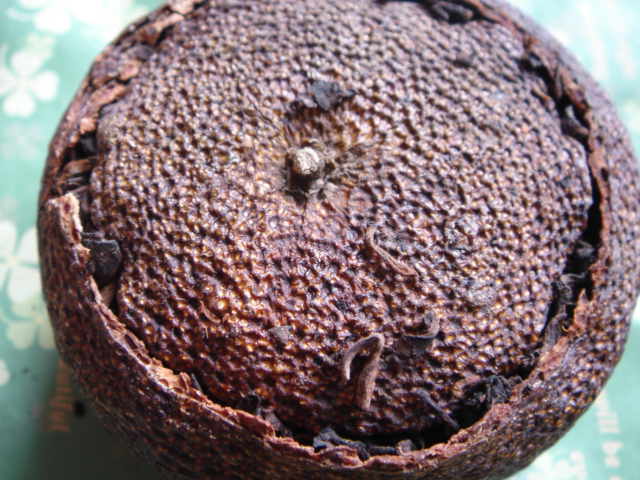 オレンジにお茶の葉を詰めて