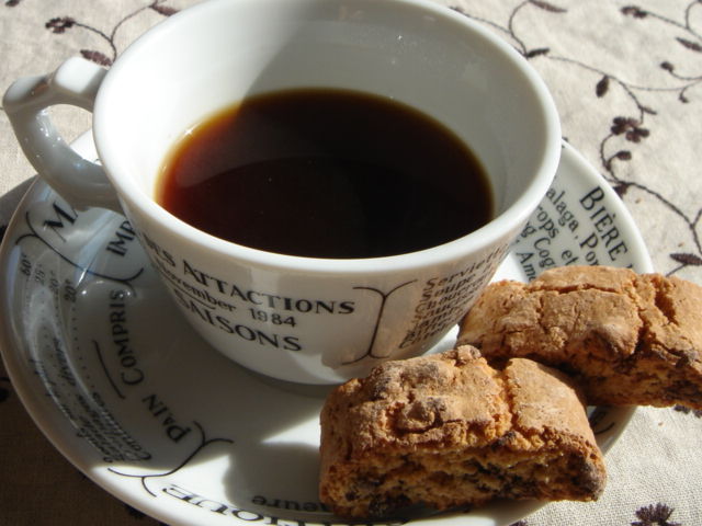 ビスコッティをエスプレッソに軽く浸けていただきます